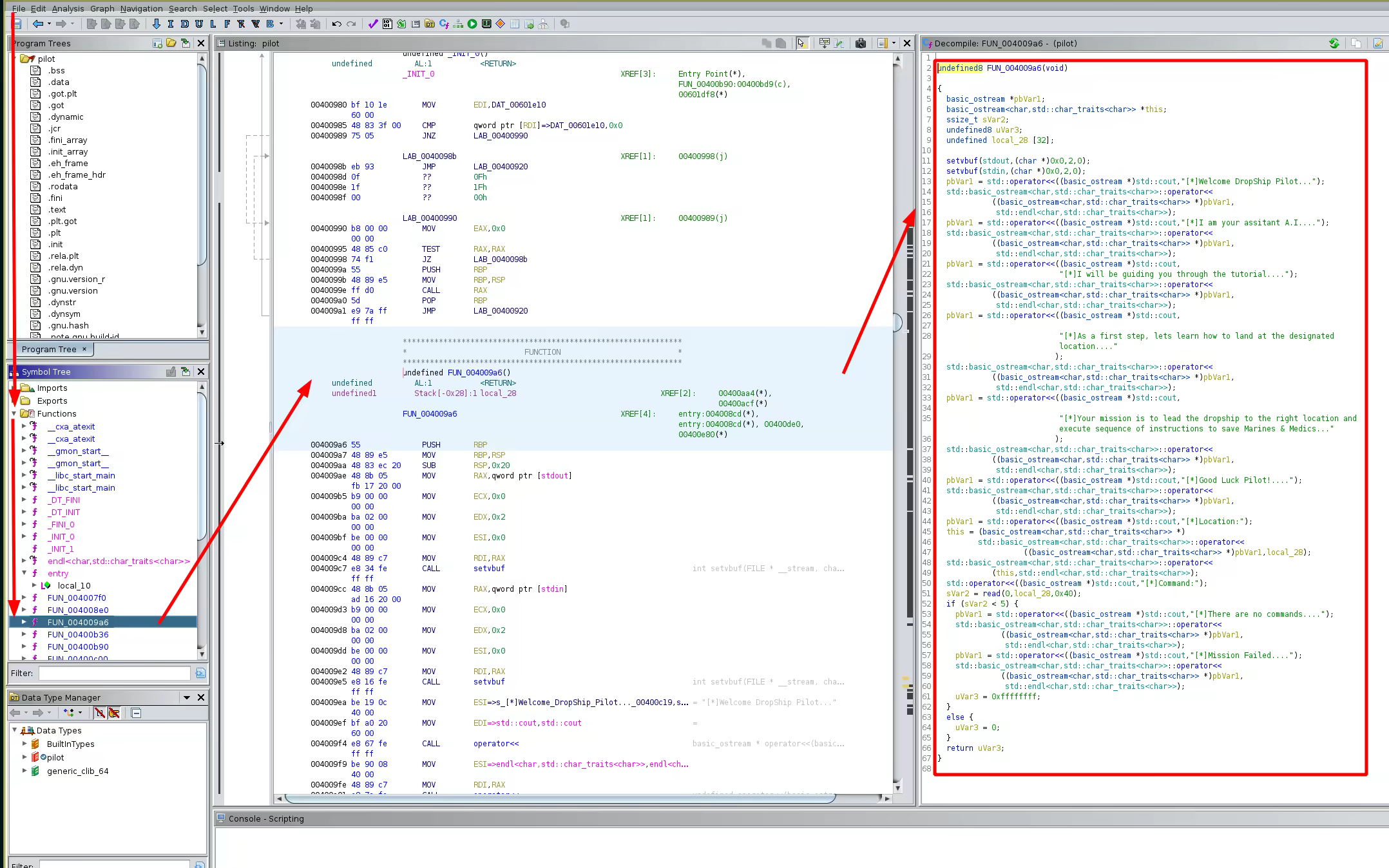 Now unlike the previous challenges, the main function called isn't called 'main' instead it is called 'FUN_004009a6'. Now let's inspect the parts of the code that are interesting: