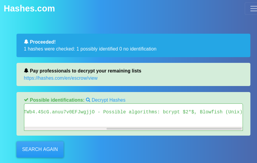 Suprisingly hash-id can't identify the type of hash here, so let's identify it online: