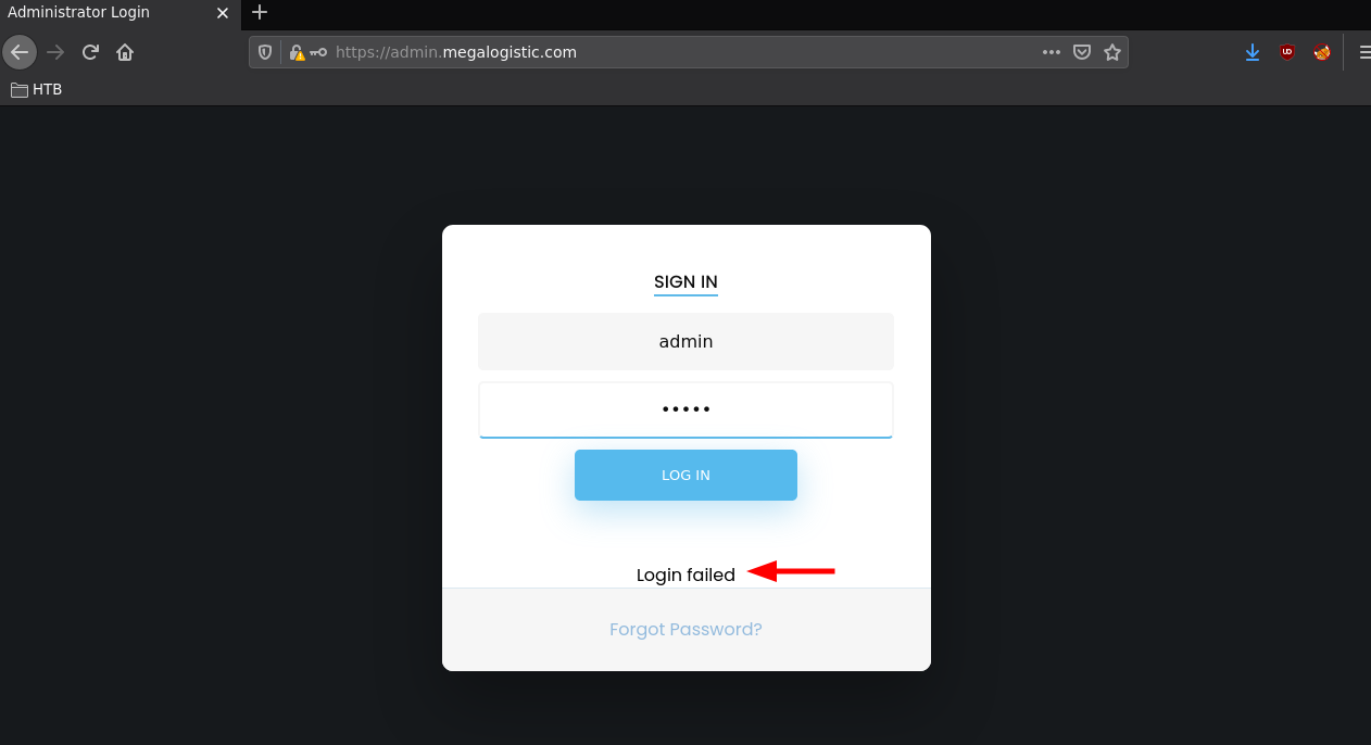 Our nmap scan also picked up the admin.megalogistic.com domain name from the self-signed SSL certificate, so let's add it to our hosts file: