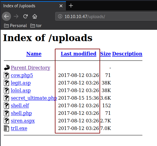 Looking at /uploads we get a directory listing which contains a bunch of malware but the timestamps show us that it's probably not going to help us: