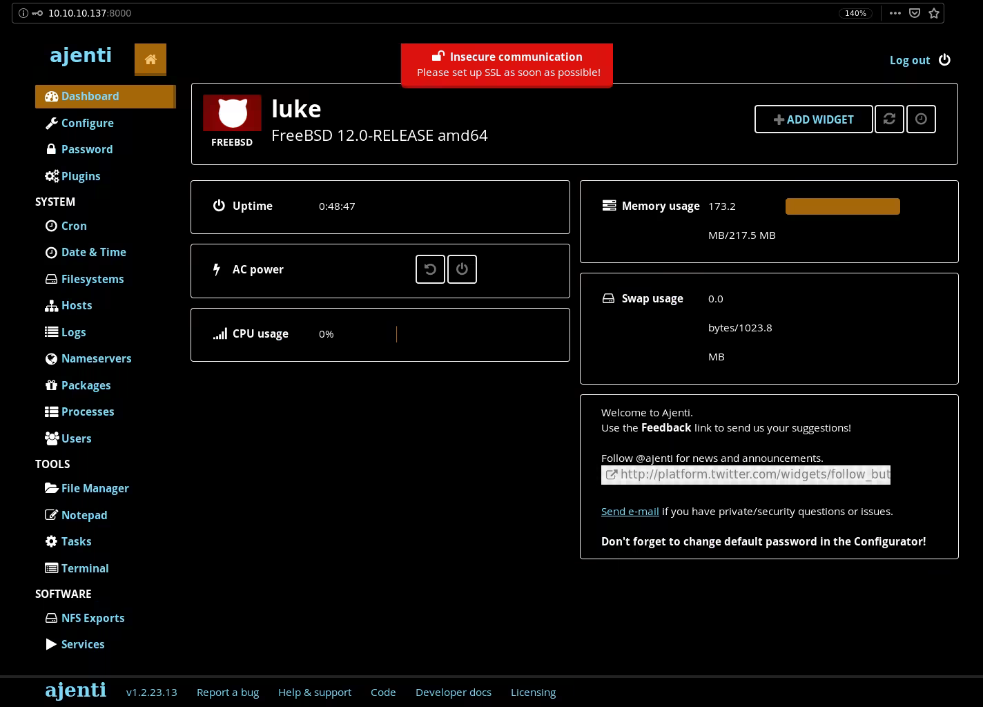 Once logged in we are able to get more information about the box which is a FreeBSD 12.0-RELEASE amd64 machine. From there we simply head over to the terminal tab, from which we can execute commands as the root user, and therefore print out both flags.