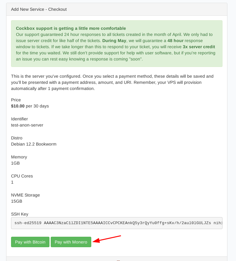 validate the VPS purchase with the Monero option: