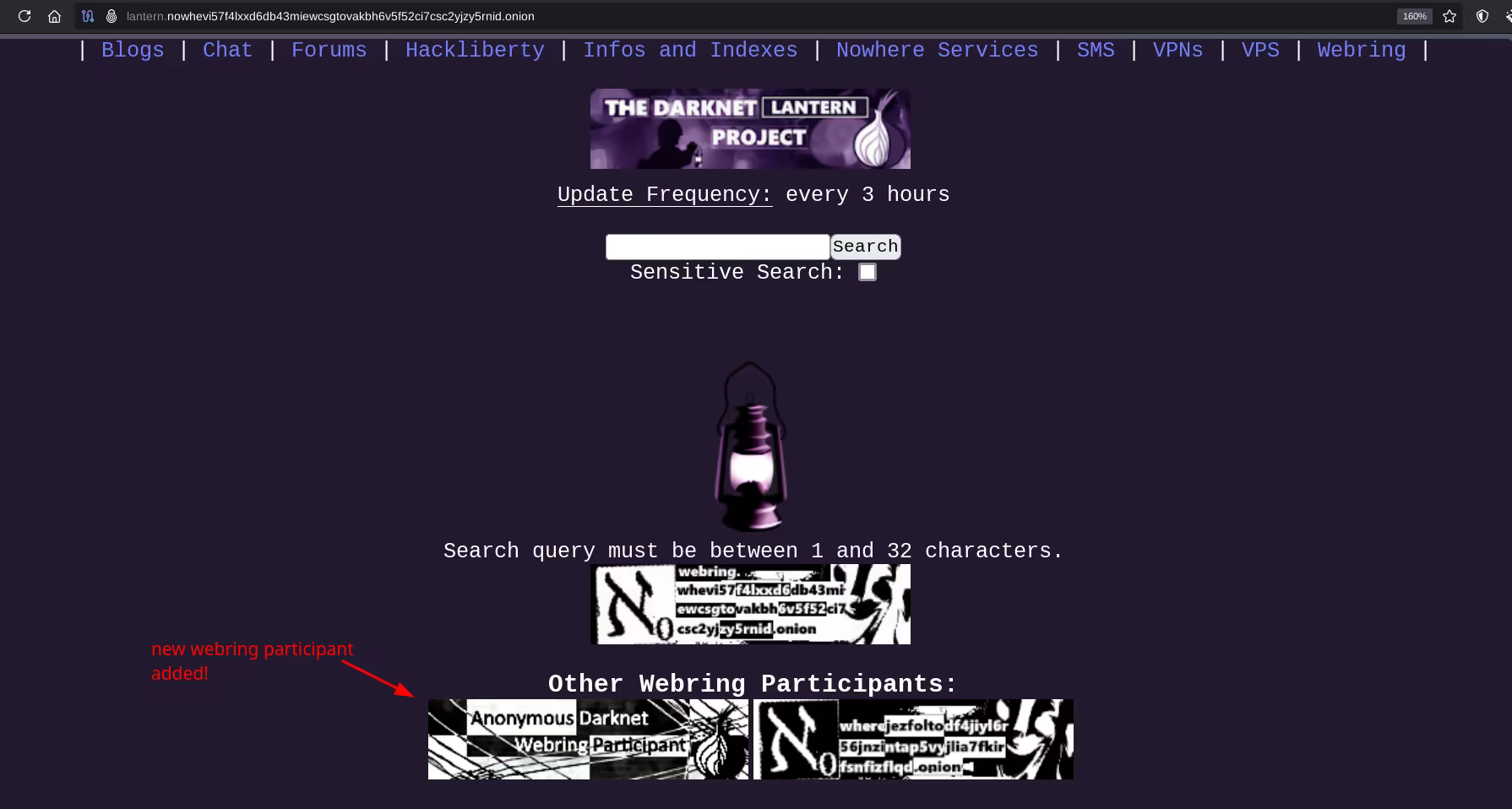 What is the onion domain of the new webring participant? (ex: lantern.nowherejezfoltodf4jiyl6r56jnzintap5vyjlia7fkirfsnfizflqd.onion) lanterntest.nowherejezfoltodf4jiyl6r56jnzintap5vyjlia7fkirfsnfizflqd.onion