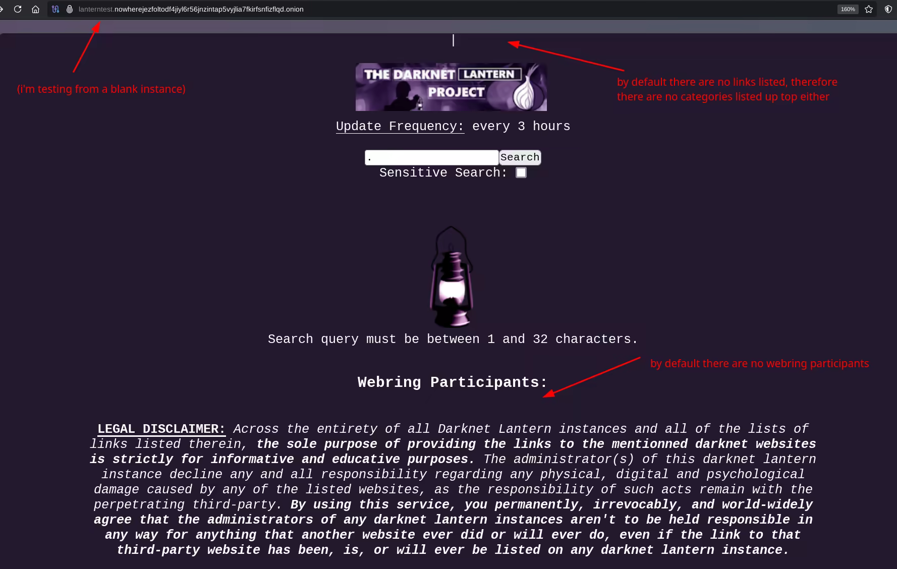 [+] Welcome to your own Darknet Lantern Instance, where you can explore the Darknet and help others do the same.