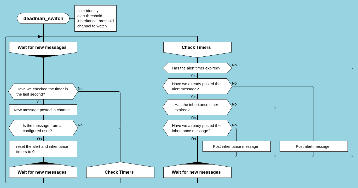 Here is a Drakon diagram of the dead man's switch logic.