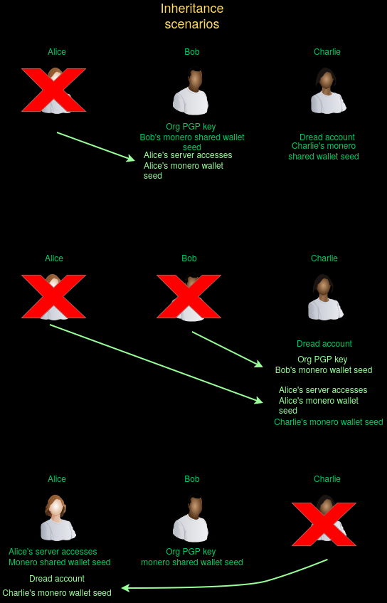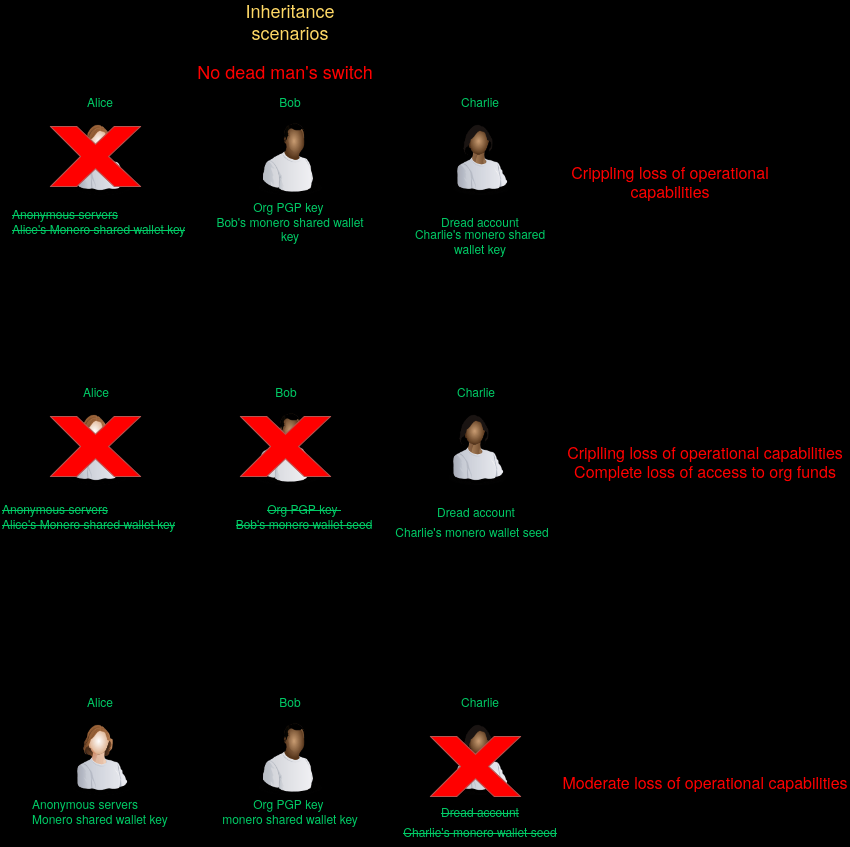 then, if they get compromised or captured the remaining members can keep the organization running, because the dead man's swwitch will ensure that the critical accesses of the compromised member get forwarded to the member chosen to replace them, their heir.