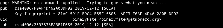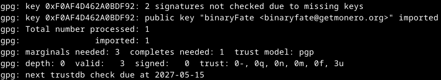 gpg --import binaryfate.ascif the public key is new and isn't saved you will get this output