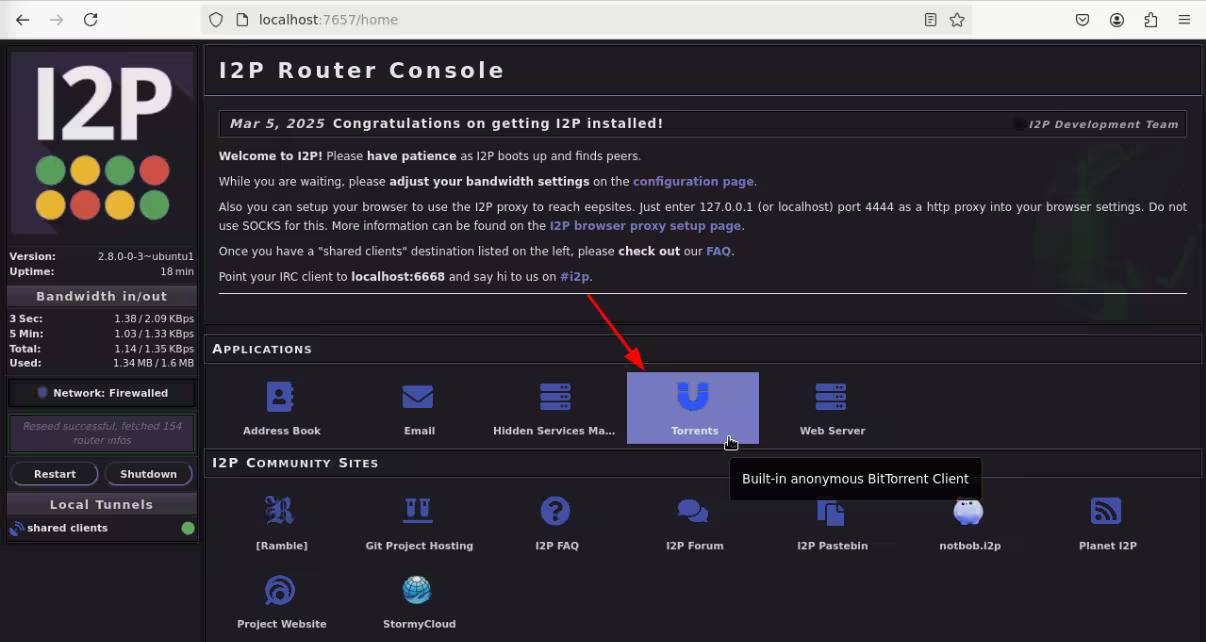 To do this, we need to navigate back to the I2P Console and click on the Torrents application: