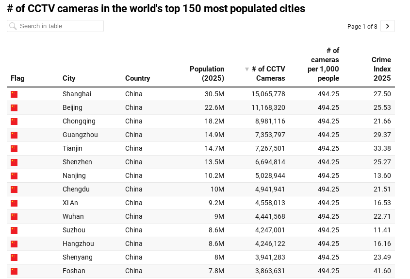 As you can see, China is excluded from this map, and there's a simple reason for that. With a population of 1.42 billion, the current estimate of 700 million cameras means there are 494.25 cameras for every 1,000 people in China. That's nearly one camera for every two people. If China were included on this map, other cities would barely register.
