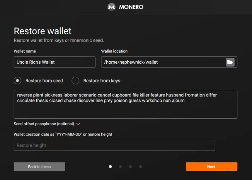 Nephew Nick opens up his Monero Wallet GUI and navigates to "Restore wallet from keys or mnemonic seed"
