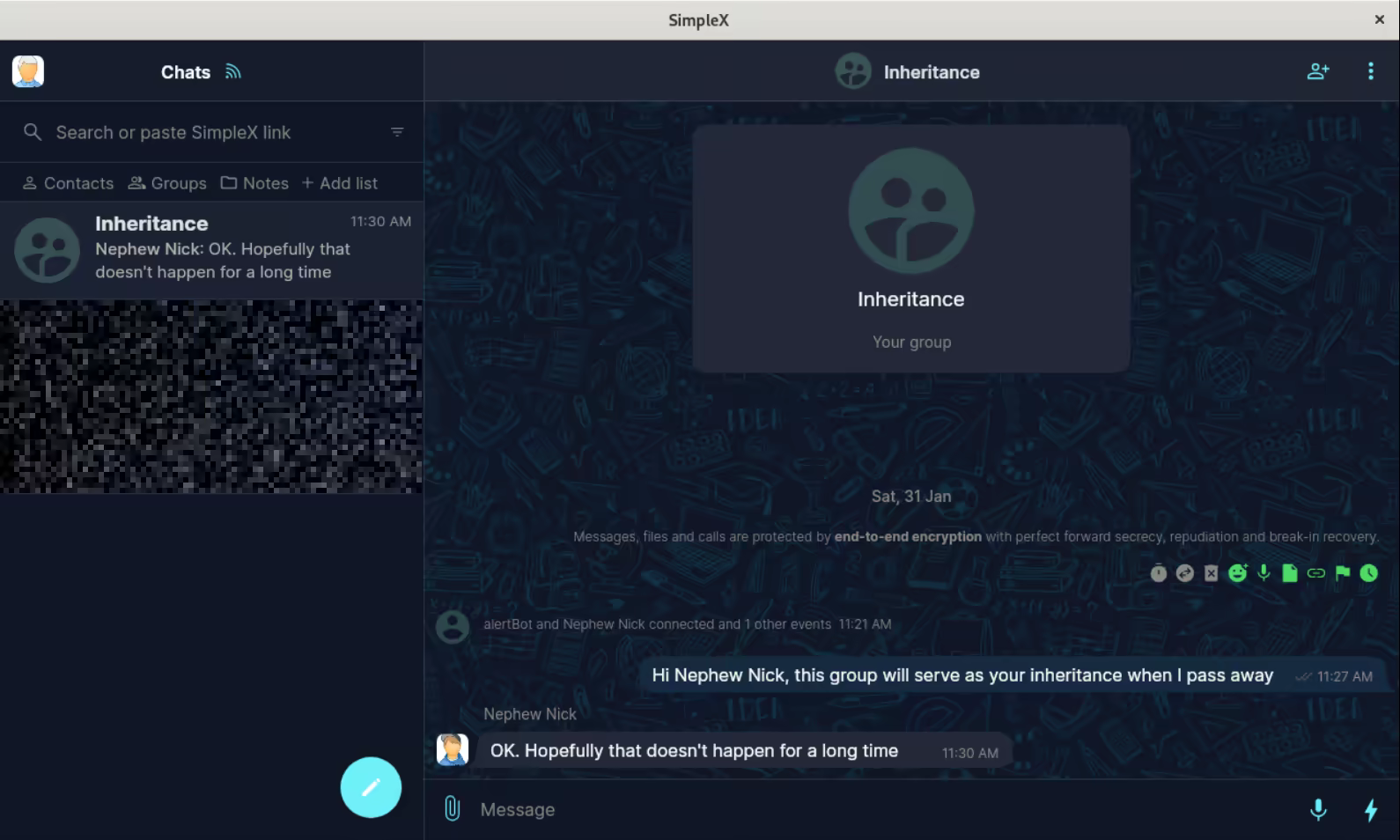 Uncle Rich needs to create a SimpleX chat which will serve as his communication channel with Nephew Nick for anything related to inheritance.