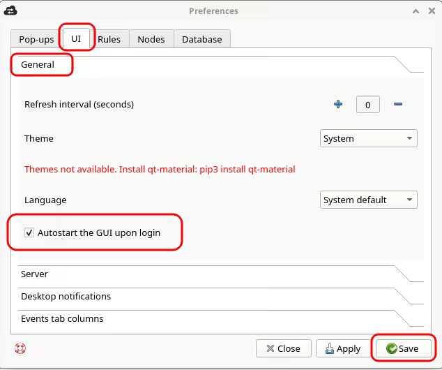 Under the "UI" tab, click on "General" and "Autostart GUI upon login" so that OpenSnitch always opens when you log into your system. Click Save.