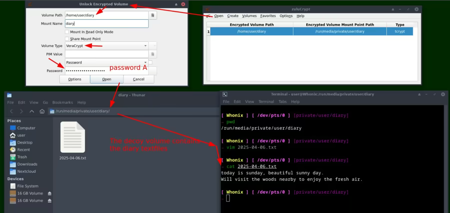 This small veracrypt volume will be called "diary" and it's decoy partition will simply contain a text-based diary of yours. However we need to be careful as we're going to save that file in places that the adversary may access, We need to make sure that the decoy volume data changes, every time the hidden volume changes. This is because otherwise we wouldn't have a way to justify why the overall veracrypt volume changed while the decoy volume didn't change (which would then prove the existance of the hidden volume).