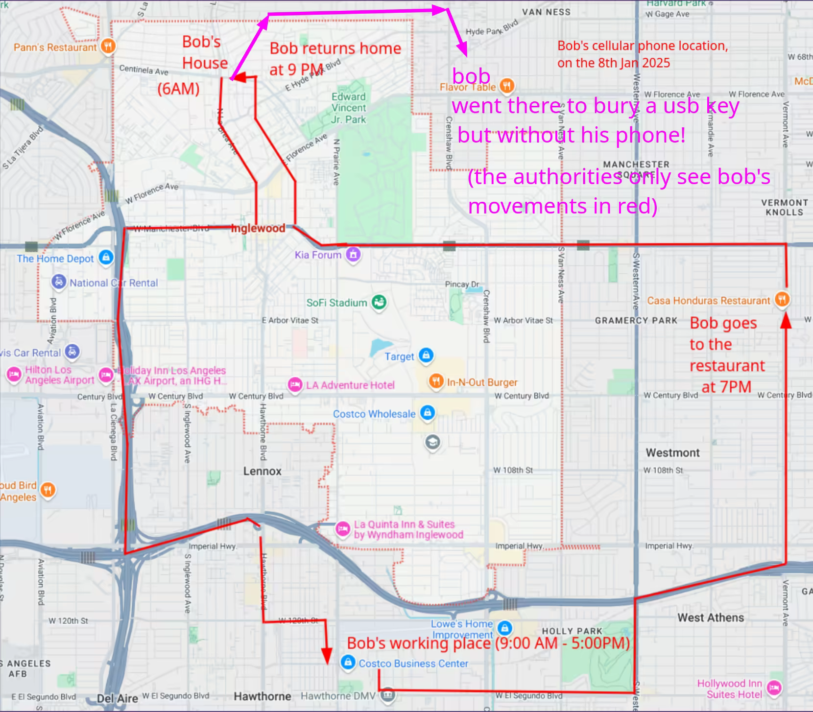 Here for instance, the adversary wouldn't see your movements in pink, the only clues they'd have are the movements in red that they can anyway see from their dashboards. However it doesn't stop there, if you actually are a high value target you should instead backup to remote VPSes exclusively, as the authorities will most likely find every physical clues you might leave behind , (you might need to take into account satellite and public covert surveillance too)