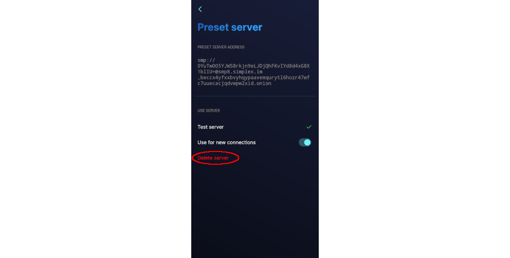 With our self-hosted SMP server set, it's time to remove the default SimpleX servers. Click on each of the presets, then click Delete server.