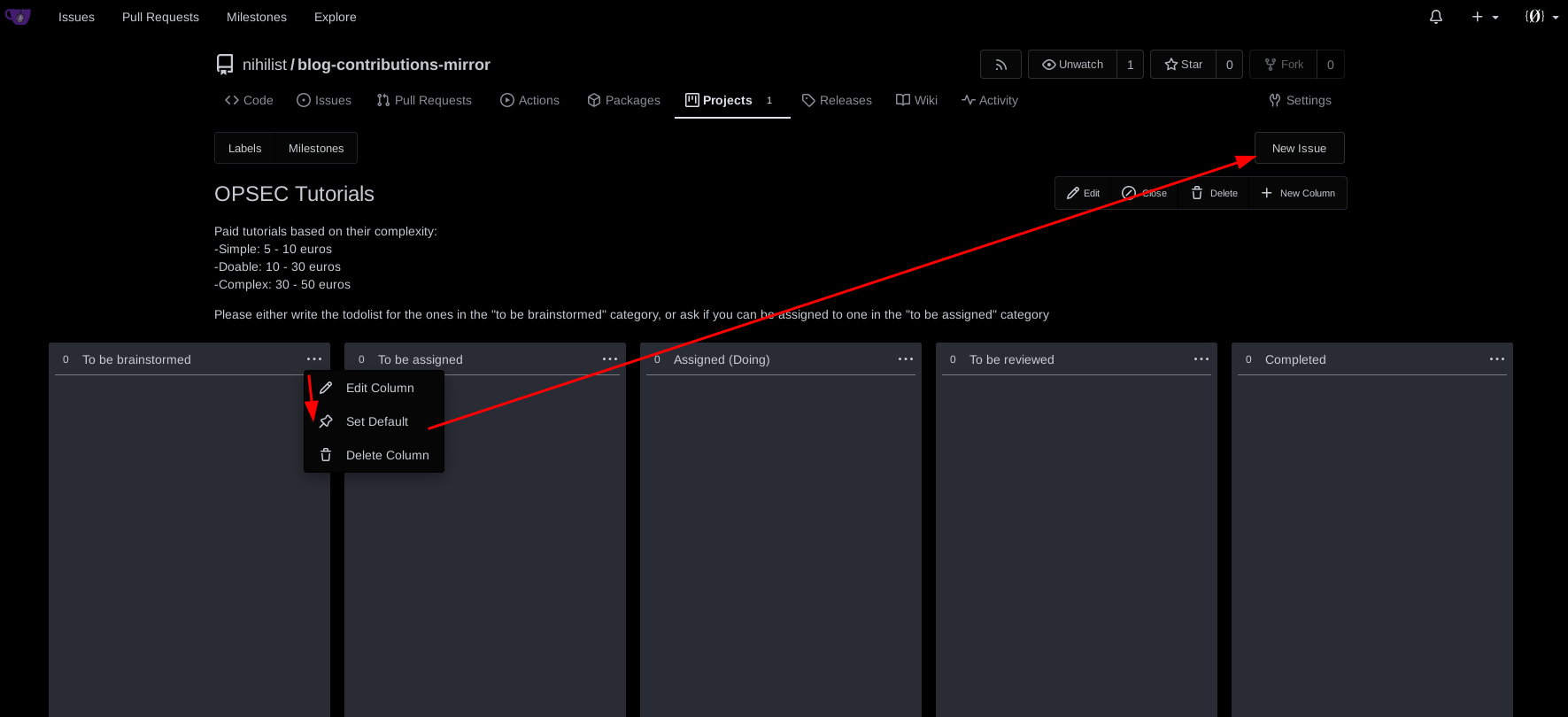 Here the workflow is preety straightforward, the first column is there for the tutorials that don't have the todolist written yet, the second column is for those that do but aren't assigned to someone yet, the third column is for the assigned tutorials (with a 1 month default deadline), the fourth column is for the maintainer to review what the contributor has sent, and the last column is for the tutorials that are completed: