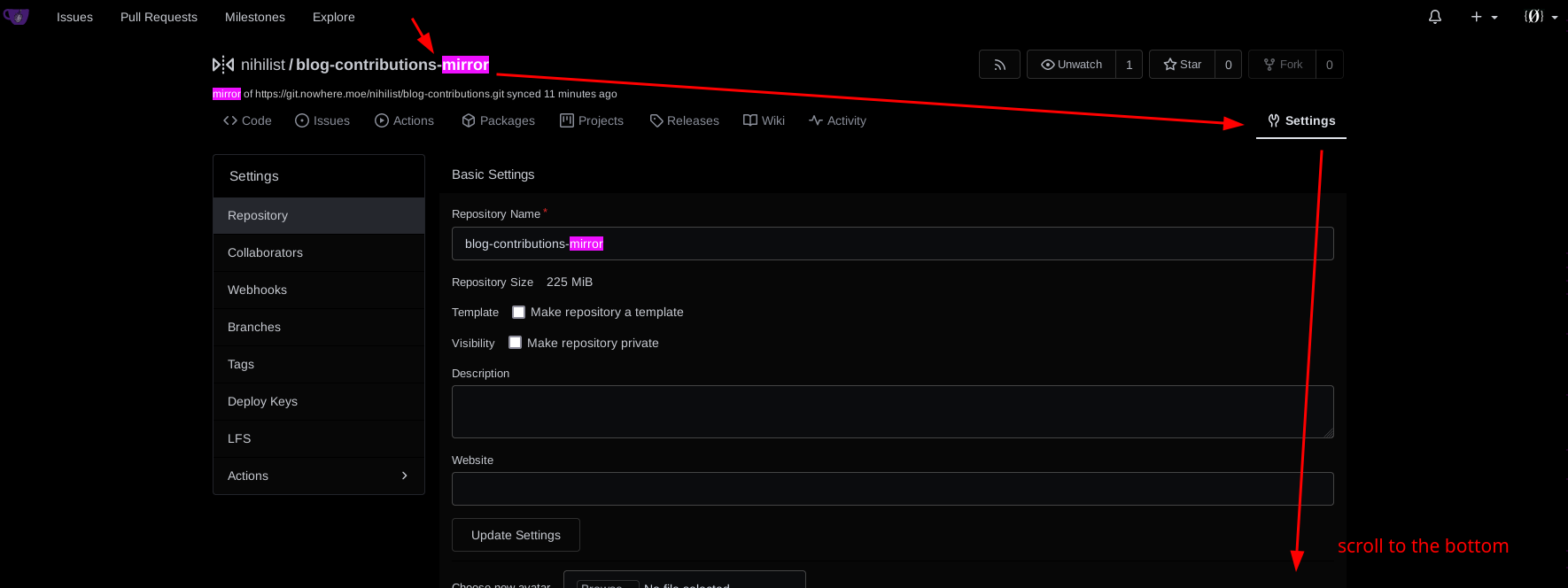 Now here you have a simple mirror git repo of the blog, once a day it will synchronize the new changes onto your mirror which is always useful to have in case if the main repository gets taken down.