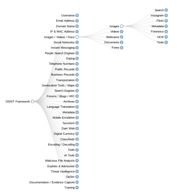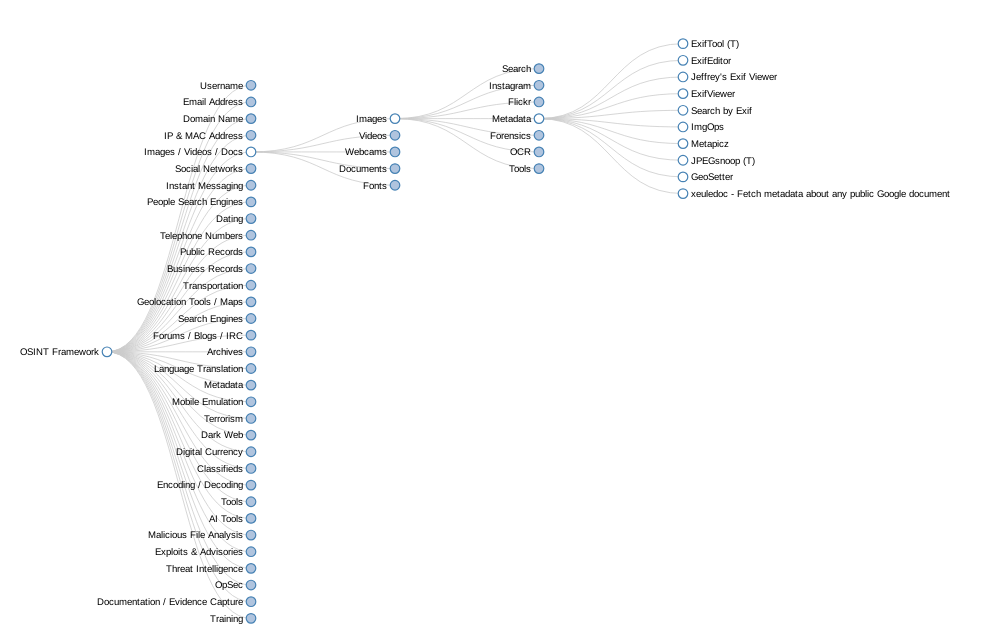 OSINT Framework is a website designed to help you find all the resources needed for OSINT investigations. It is structured as a simple tree, where each category leads to subcategories and ultimately to specific tools. For example, if you want to extract metadata from a photo, you would first select the "Images / Videos / Docs" section in the tree.