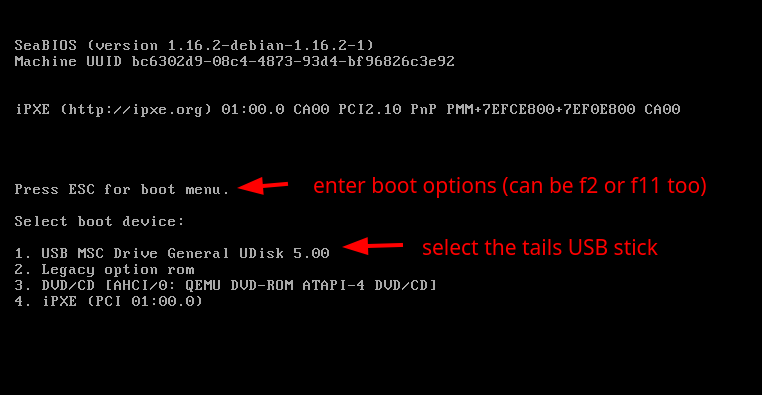 Now that the Tails OS image has been flashed onto the usb stick, you can simply reboot your computer, and then enter the boot menu to choose to boot onto the USB rather than onto your host OS. In this example I need to press ESC, but depending on your motherboard you may need to press F2, or F11, or another key.