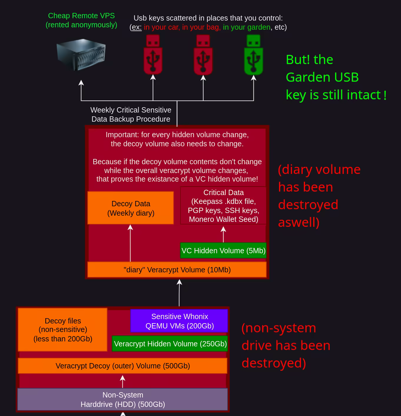 In a scenario where you are arrested or get your personal property seized/destroyed, the adversary is left empty-handed, and they can force you to type your password (even ordered by the judge) but that won't allow them to prove the existence of the VeraCrypt hidden volume because you will type the decoy volume password instead of the real one, which won't expose the existence of your hidden volume or VPS.