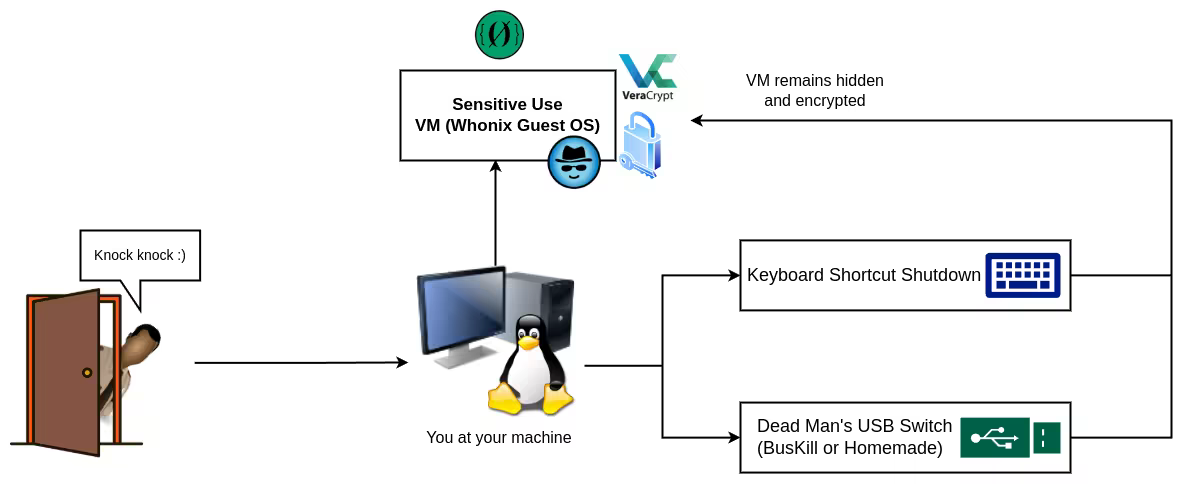 We are going to use the Sensitive VM concept, so we will be installing Whonix on a VM inside of a VeraCrypt Hidden Volume to further our deniability. We also need to setup an emergency shutdown plan.