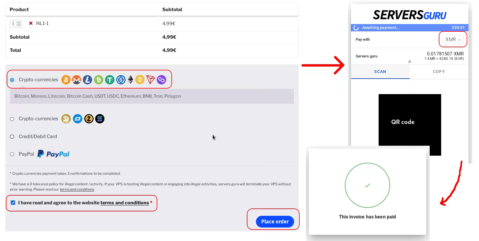 When we go to the provider's website we're going to choose a VPS and then checkout and pay with Monero. The exact steps will depend on your provider but will be something similar.
